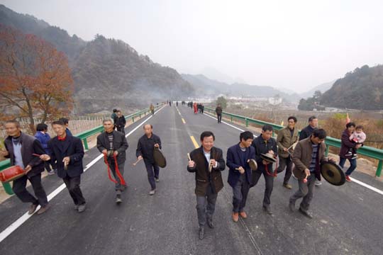 11月10日,大別山旅游扶貧快速通道水毀修復(fù)工程漁潭段改線建成通車。當(dāng)?shù)卮迕袂描尨蚬?、載歌載舞,以自己特有的方式歡慶這一時(shí)刻的到來.